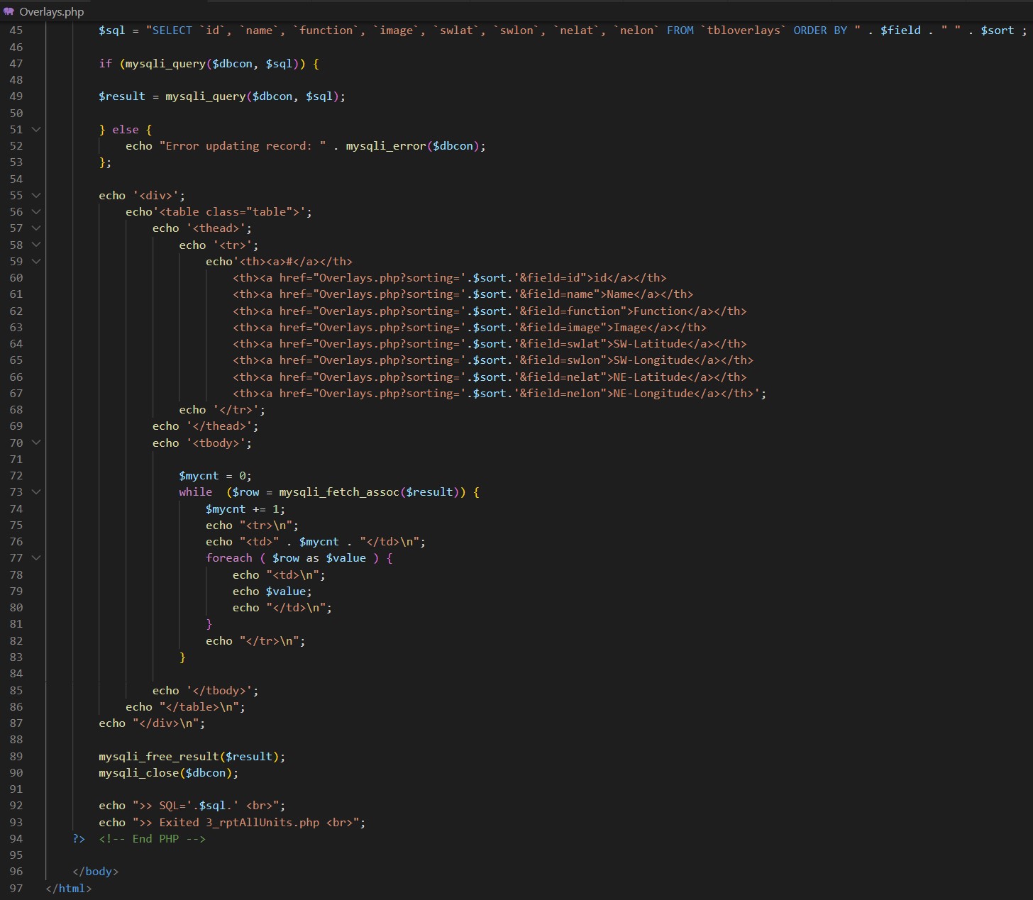 >> SQL='.SELECT `id`, `name`, `function`, `image`, `swlat`, `swlon`, `nelat`, `nelon` FROM `tbloverlays` ORDER BY swlat ASC.'
